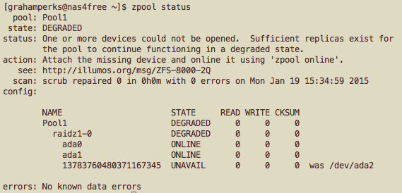The pool is now DEGRADED and one of the drives is marked UNAVAIL. Uh oh! ZFS tells us to use zpool online to bring the drive back.